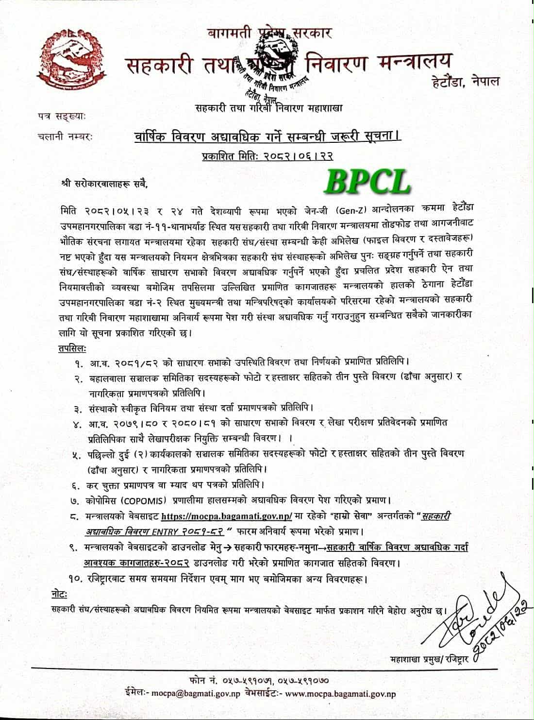 यस्तै हाल सम्म कोपोमिस प्रणालीमा विवरण अद्यावधिक गरेको प्रमाणका साथै मन्त्रालयको वेबसाईटमा रहेको सहकारी अद्यावधिक विवरण २०८१ ८२ फारम भरेको प्रमाण पनि महाशाखामा पठाउने फाईलमा समावेश गर्नुपर्ने भएको छ ।