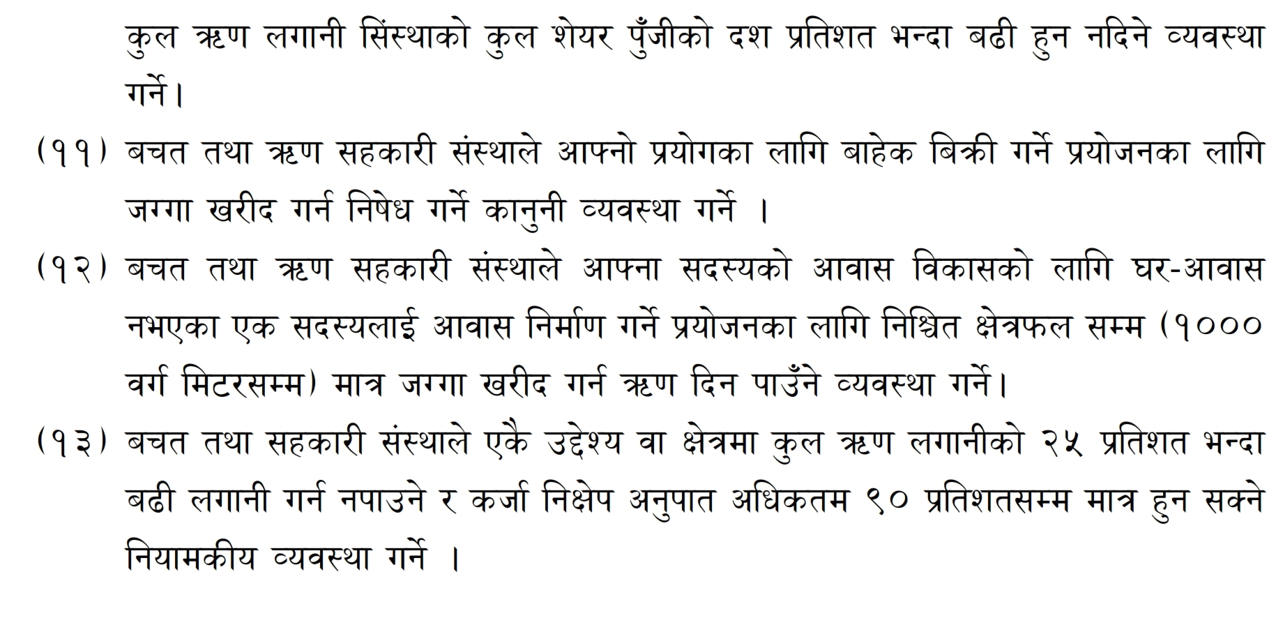 बचत तथा ऋण सहकारीले विक्री प्रयोजनका लागि जग्गा खरिद गर्न पाउने छैन । आवास नभएका सदस्यका लागि अधिकतम १ हजार वर्ग मिटरसम्मको जग्गा खरिदमा मात्र ऋण दिन पाइनेछ । एउटै उद्देश्य/क्षेत्रमा कुल ऋणको २५ प्रतिशत भन्दा बढी नहुने र कर्जा–निक्षेप अनुपात अधिकतम ९० प्रतिशतसम्म हुनसक्ने सूचनामा उल्लेख छ ।