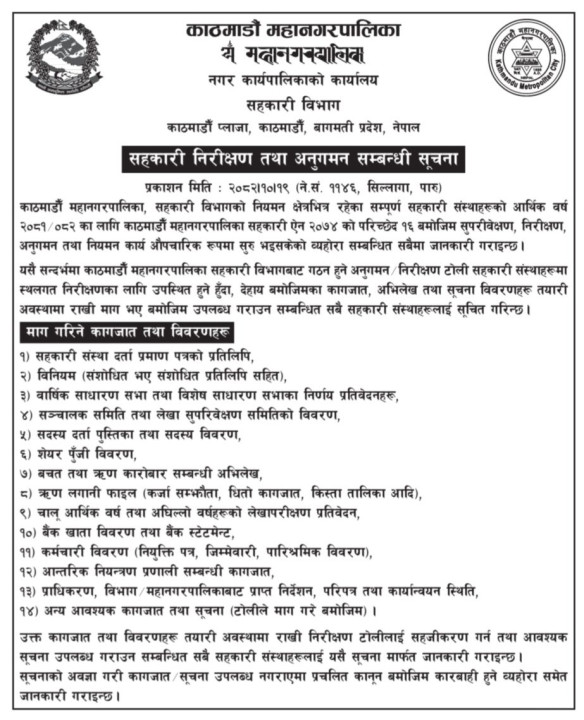 महानगरपालिकाको सहकारी विभागले एक सूचना जारी गरेर मातहतका सहकारीकाे सुपरीवेक्षण, निरीक्षण, अनुगमन तथा नियमन कार्य अघि बढाएको जनाएको हो ।