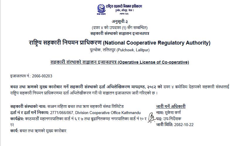 बचत तथा ऋणको कारोबार गर्ने संस्थाको दर्ता अभिलेखीकरण मापदण्ड, २०८२ को दफा ४ बमोजिम संस्थाले प्राधिकरणमा दर्ता अभिलेखीकरण भई संस्था सञ्चालन इजाजतपत्र प्राप्त गरेको हो ।
